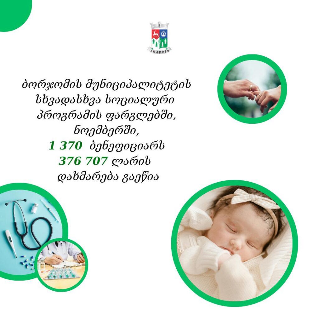 ბორჯომის მუნიციპალიტეტში მოქმედი სოციალური პროგრამების ფარგლებში, ნოემბრის თვეში, 1 370 ბენეფიციარს 376 707 ლარის დახმარება გაეწია.