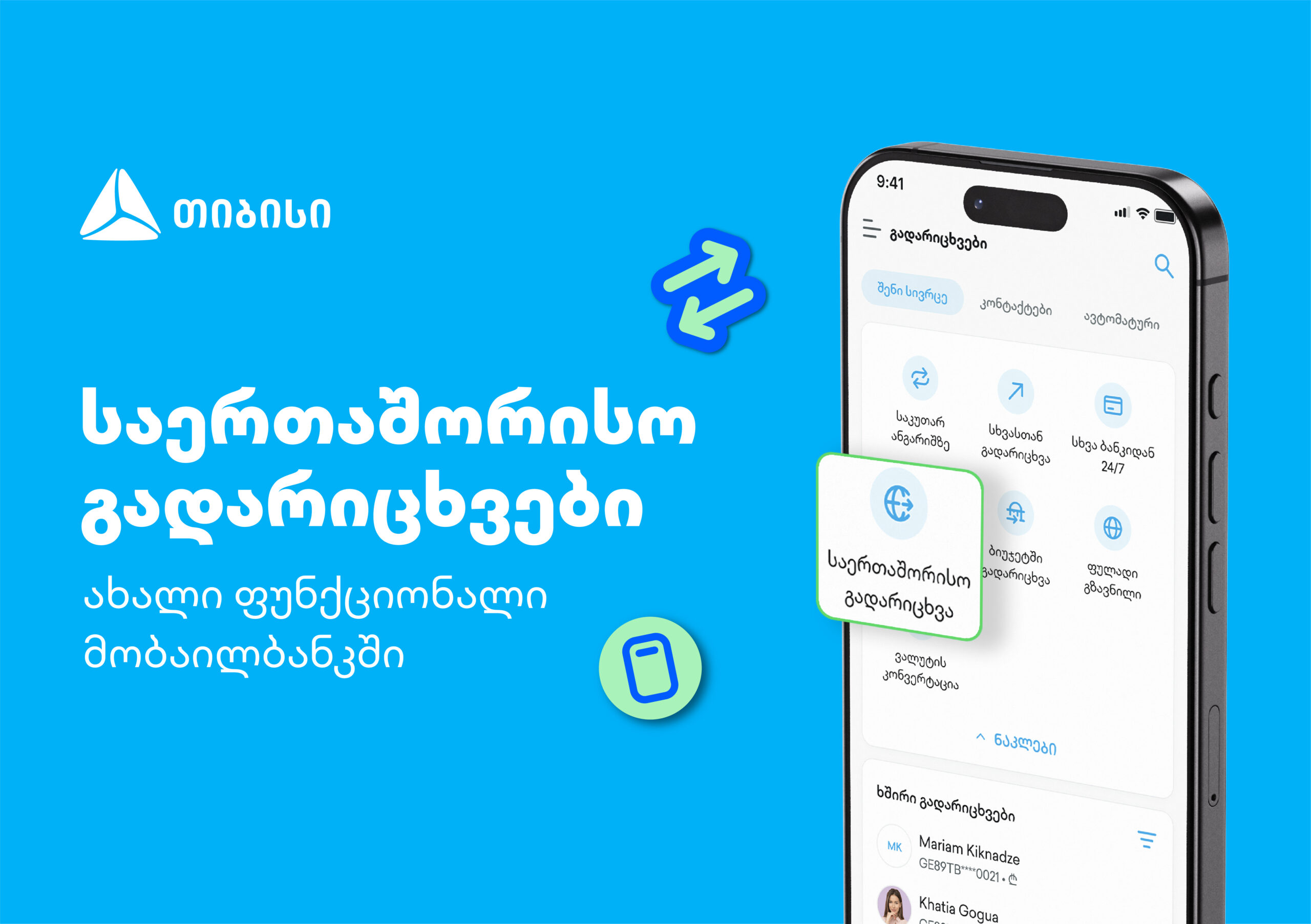 თიბისიმ, მომხმარებელთა ყოველდღიურობის გასამარტივებლად, კიდევ ერთი ახალი პროდუქტი დანერგა — მობაილბანკის მომხმარებელ ფიზიკურ პირებს საერთაშორისო გადარიცხვების განხორციელება უკვე ფილიალში ვიზიტის ან ვებ-ბანკში შესვლის გარეშე, პირდაპირ მობილური აპლიკაციიდან შეუძლიათ.
